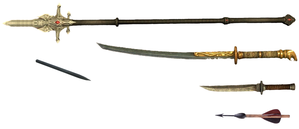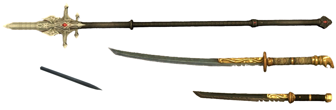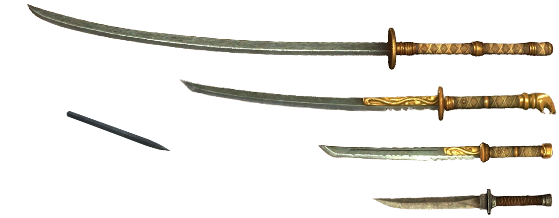 Revikus' weaponry is a set of blades passed down through the generations. These blades are made in the Tsaesci style, a single edged curved blade of folded steel. There are four blades in particular: the Odachi, Katana, and Tanto.The Odachi, or Great Sword, is the oldest of the blades and was carried into battle by the oldest of Revikus' line. It is relatively unadorned, a simple single edged blade which can cut men and beast alike.His most commonly worn weapons however are his katana and tanto. The katana is believed to have been forged for his ancestor Xhennuk-Ras, one of the founded members of the fighters guild. Reflecting the time in which they were forged, they are far more ornamental in nature featuring snake motifs. He also carries a wakizashi in a similar style, but for formal situations rather than battle.The tanto is the newest blade and one forged in Akariue. It is a simple, single edged dagger made of steel. It was made after the Wakizashi was lost for a time, only found after the dagger was forged.Beyond his melee weaponry, Revikus keeps a small set of bo shuriken typically kept in a pouch under his right pauldron. These throwing spikes are used to distract and misdirect, rather than outright kill.