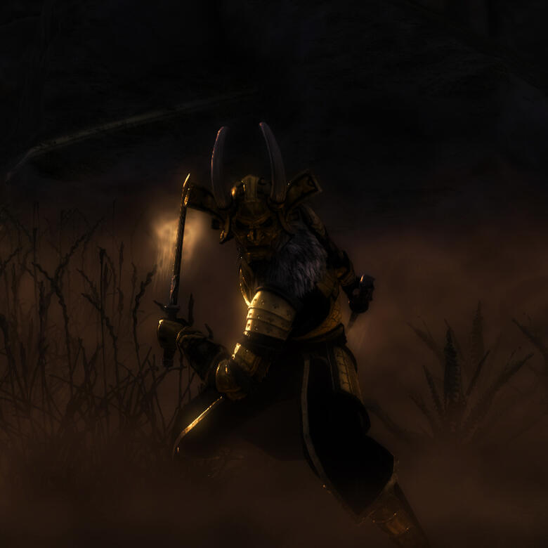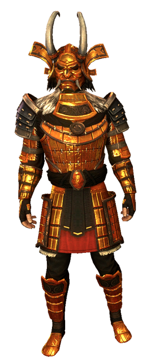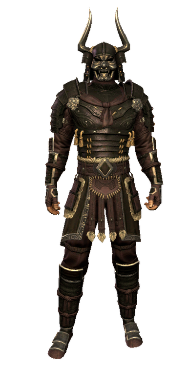 A set of gold-laquered, iron scaled armor, this set has been passed down Revikus' family for generations. The stories told are that this set of armor was forged soon after the death of Reman III and the rise of the Potentates.The armor itself is made to be more ornamental than practical, however it is more than capable of being used in battle. In spots not covered by the lamellar plates, chain and leather are sewn between layers of cloth. This allows the armor to better flow, suiting Revikus' preferred fighting style.The armor over the years has been lacquered, stripped and relacquered numerous colors. It is said when the armor was worn by Xhennuk-Ras it was lacquered steel and black. Upon arriving to Akariue, it was communally agreed to have a unified color. Using the common myths of the Tsaesci perpetuated by the books Mysterious Akavir and the 2920 novels as a template, they melted down and shaved gold objects. Their armor was lacquered to various shades of gold, to reflect their golden scales.
